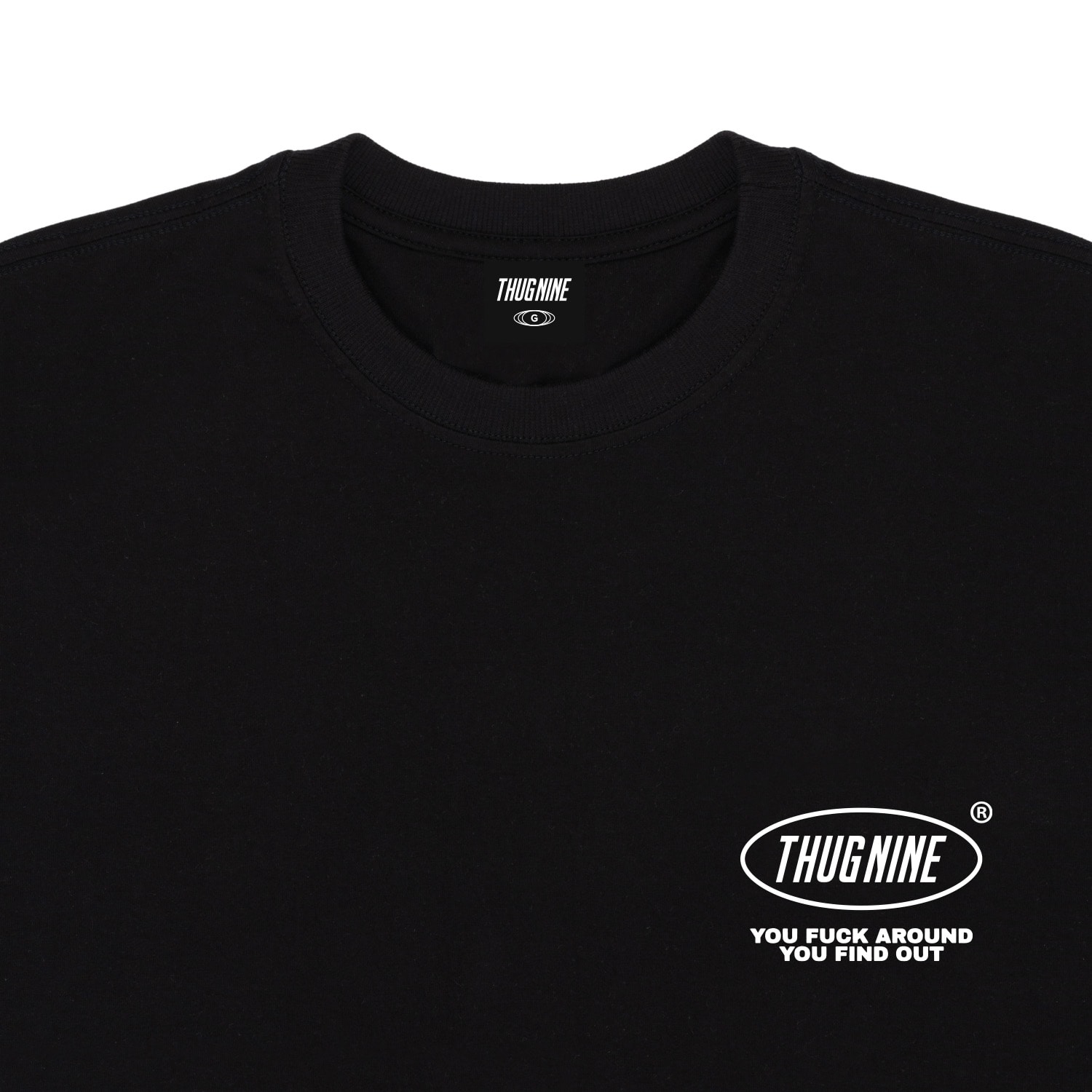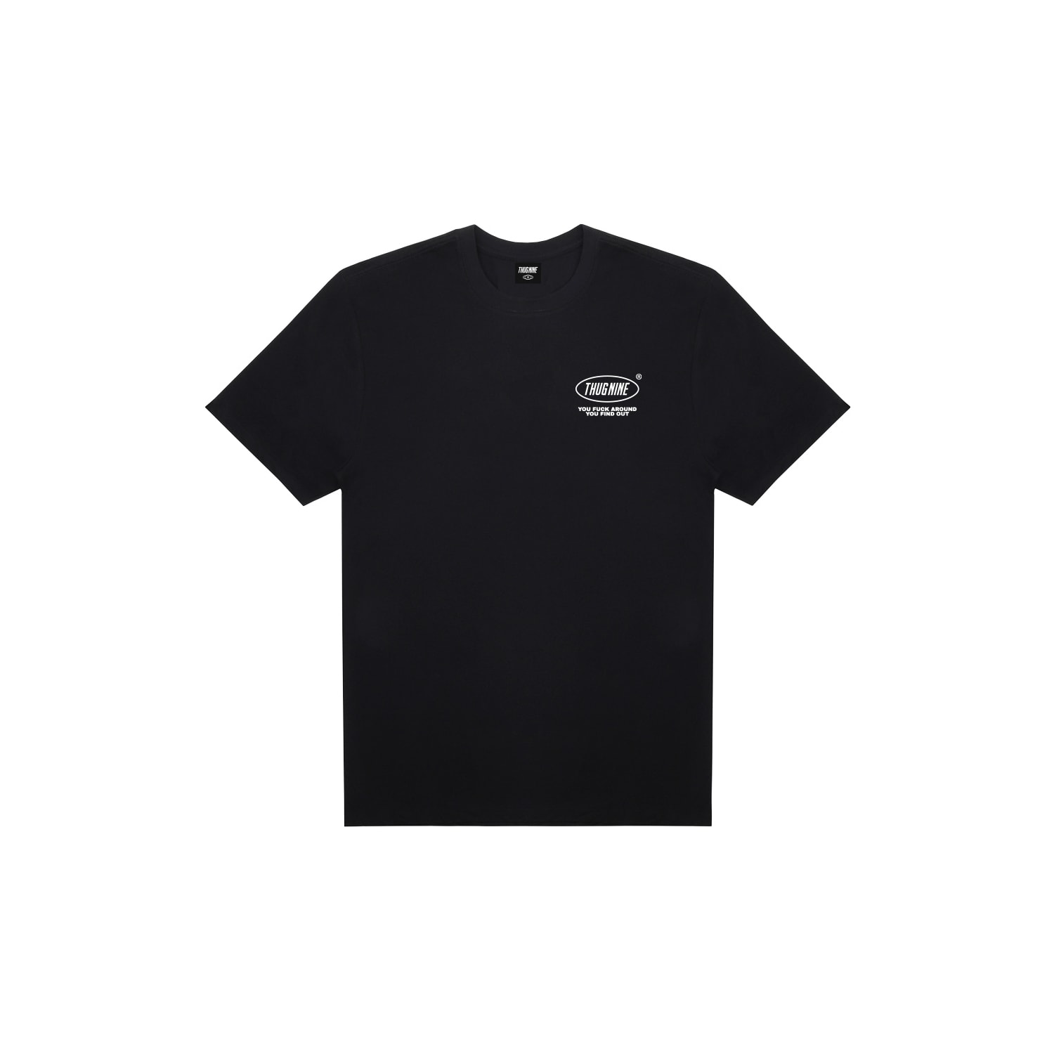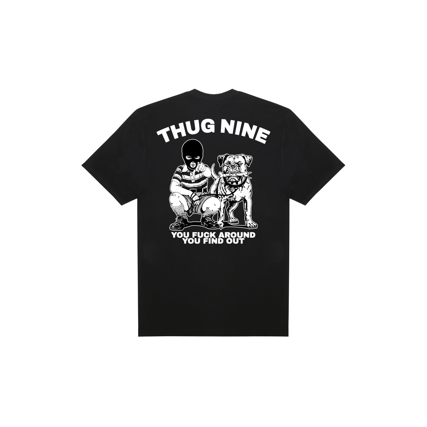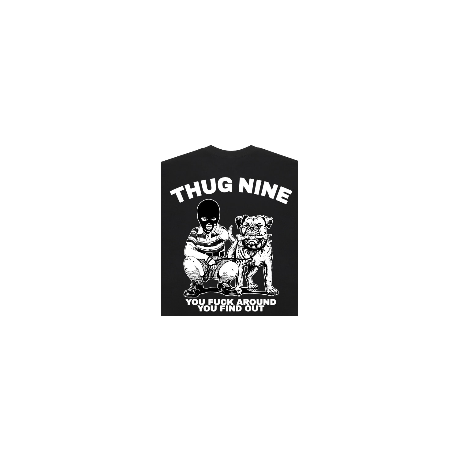 A estampa "Kid" traz aplicação frontal discreta com logotipo Thug Nine no lado esquerdo do peito. O destaque da peça está nas costas, com uma arte impactante que, acompanhada da frase “YOU FUCK AROUND YOU FIND OUT” em fonte marcante. Uma camiseta que transmite atitude e estilo.