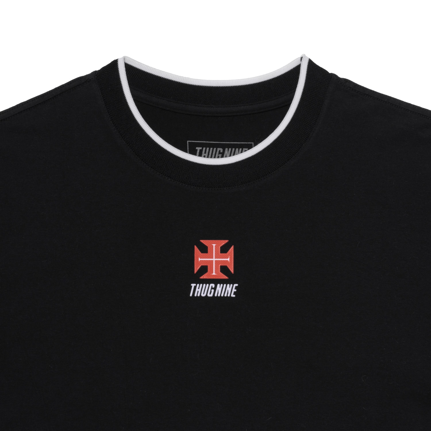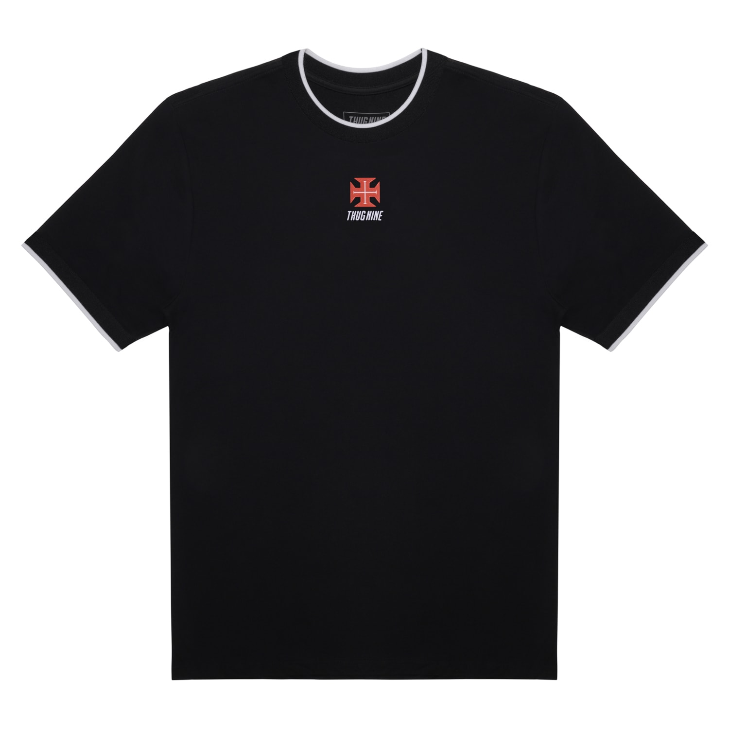 O design apresenta o clássico brasão Vasco em vermelho aplicado no centro do peito, enquanto o brasão de São Januário aparece de forma discreta e elegante na parte superior das costas. Os punhos trazem detalhe branco que reforça o contraste com o corpo da peça. Finalizando, a etiqueta exclusiva Thug Nine x Vasco aplicada na parte inferior frontal garante autenticidade e reforça a parceria.